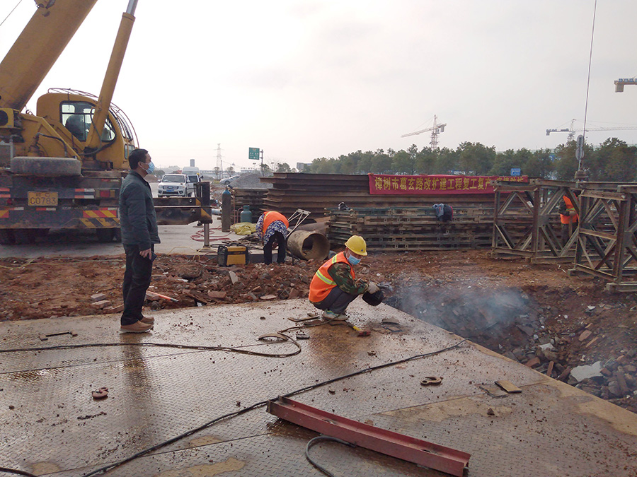 嚴(yán)抓復(fù)工后的疫情防控工作。圖為2020年2月24日樟樹葛玄路臺(tái)埠中橋便道鋼便橋施工現(xiàn)場